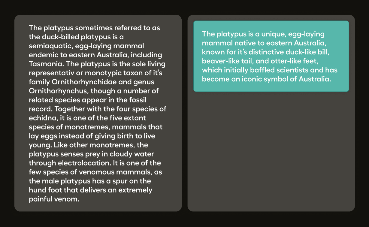 • <Text> - The Text tag is used to display text provided by the input data. Given the example input data below, the text blocks are either displaying information from the prompt or one of the responses (answer1 or answer2). You will likely want to adjust the values to match your own JSON structure.
